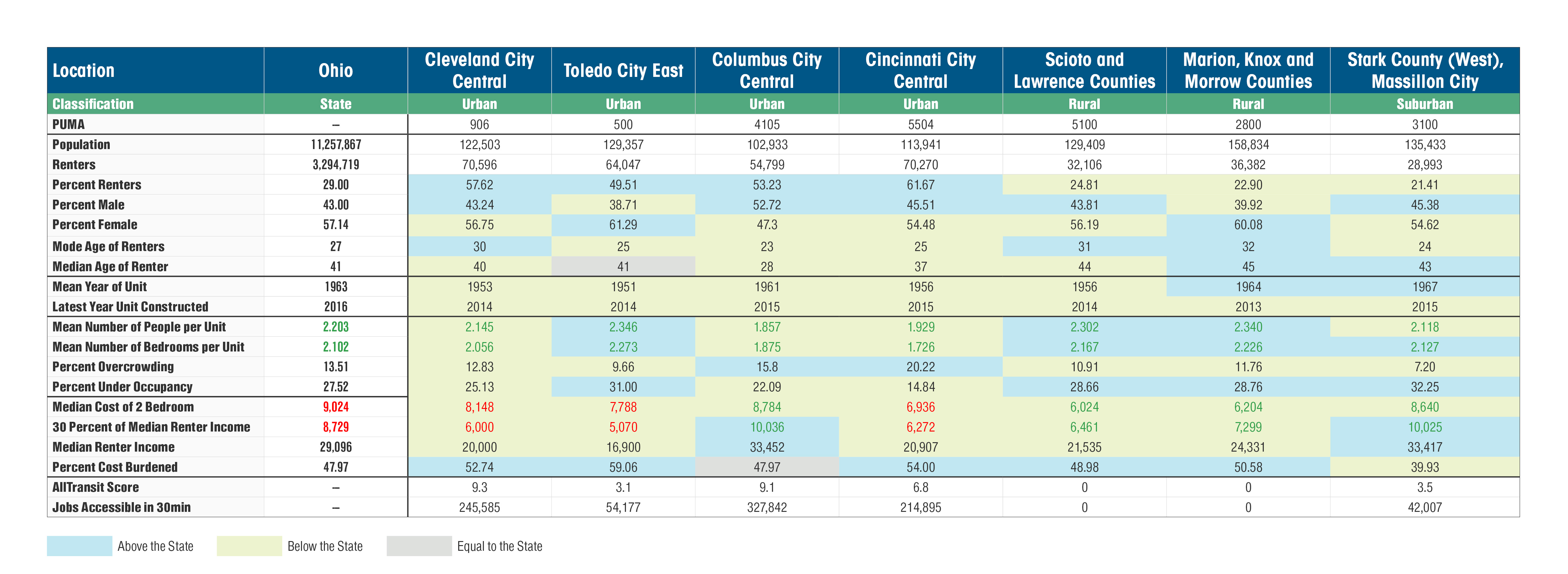An analysis was conducted on all of Ohio's Public Use Microdata Areas (PUMAs). The data comes directly from the 2016 American Community Survey microdata obtained from IPUMS-USA, which contains a sample of de-identified survey responses. This state-level research reported on factors of affordability, space and transit.