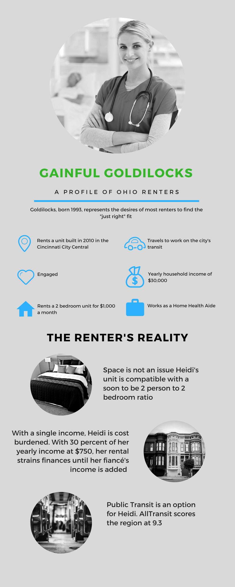 Housing fit helps people find communities that fit their social, financial, occupational and lifestyle needs. Even though Goldilocks is fortunate to have a career and a fiancé to share expenses with, she still faced challenges in her search, including the age of properties, access to transportation and high rental costs in areas that are suitable to her. Helping renters find homes that are "just right" will improve the health of Ohio's communities by bringing efficiency and sustainability to the real estate market. It will also help residents live healthier, happier and more successful lives.