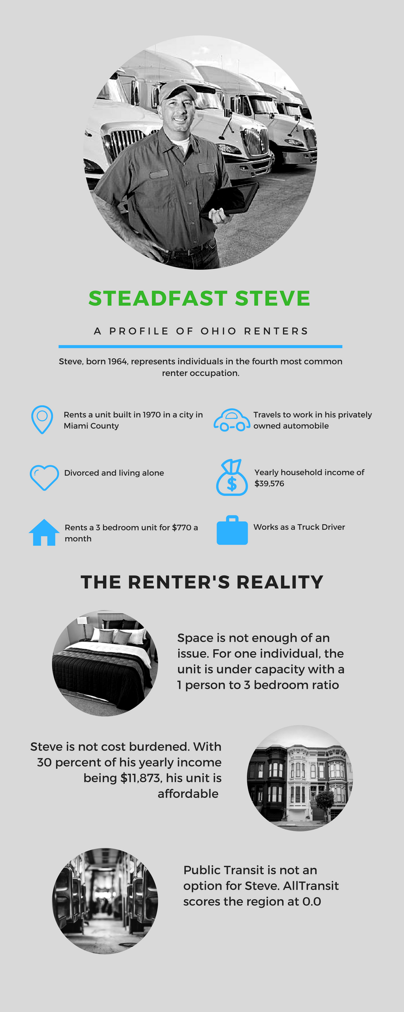 To humanize the data, we created profiles based on the most common occupations to report the most frequent combination of renter realities. The profiles were generated by career popularity in renter populations, since job access directly impacts the location and affordability of a residence. While the names and photos represent fictional characters, the stories behind them are real and representative of ordinary Ohioans.