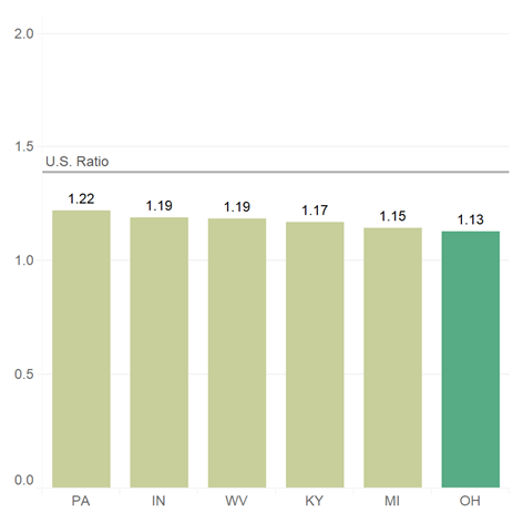 Ohio stands out from its peers on a number of key metrics. First, Ohio has the lowest median household debt-to-income ratio (1.13) among neighboring states. Having a low debt-to-income ratio means one less barrier for prospective homebuyers on the pathway to homeownership (Figure 1).