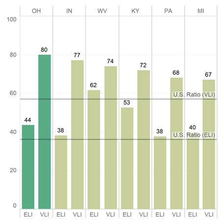Second, on the rental side, Ohio has the highest number of affordable and available units for very-low income (VLI) renters—those earning less than 50% of area median income. In 2018, Ohio had 80 affordable and available units for every 100 VLI renters, which indicates that Ohio’s housing market is closest to meeting the demand of VLI renters (Figure 2).
