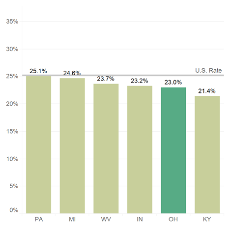 Finally, Ohio has a lower share of severely cost burdened renters (23%) than all of its peers except Kentucky. Severe cost burden measures how many renters are spending at least 50% of their income on housing related costs. A lower rate indicates more affordable housing for renters (Figure 3).