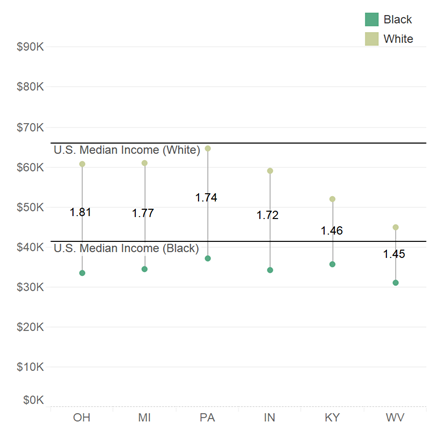 Second, Ohio continues to experience a growing racial gap in homeownership. This could be tied in part to the large gap in incomes between white and Black Ohioans (Figure 5). In 2018, the median household income for white households was $60,783, compared to $33,590 for Black households, making the income gap (1.81 points) larger than the gaps in all five of Ohio’s neighboring states. However, income does not fully explain the homeownership gap. A number of factors, including discriminatory practices such as redlining and high home mortgage denial rates (37.8% for Black Ohioans vs 21.6% for white Ohioans) have impacted and continue to affect Black families’ ability to build wealth through homeownership.