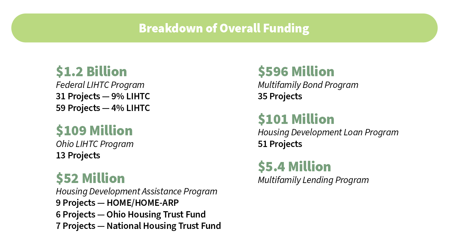In state fiscal year 2025, OHFA funding constructed 5,286 new housing units and preserved 2,897 — the majority of which were for families throughout Ohio. OHFA also allocated $1.2 billion in federal LIHTC to help in the development or preservation of many of these units. The housing created with LIHTC financing will remain affordable to Ohioans for 30 years. You can learn more about LIHTC in our State Fiscal Year 2025 Annual Report.