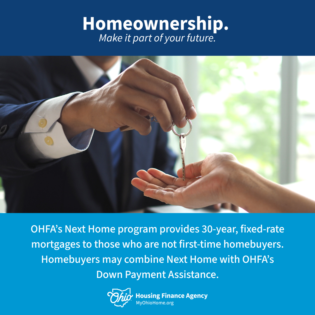 Suggested Text for Real Estate Agents: Not a first-time homebuyer? Not a problem! OHFA's Next Home program offers down payment assistance.